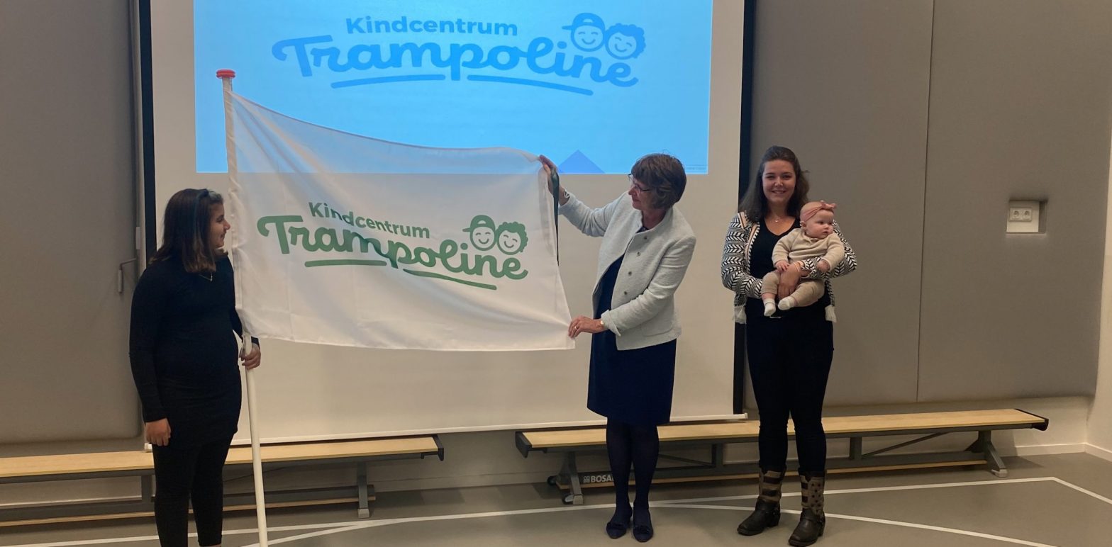Op vrijdag 15 oktober werd kindcentrum Trampoline officieel geopend door onder andere Wethouder Juliette Bouw. Samen met de jongste en de oudste leerling onthulde zij de vlag van Kindcentrum Trampoline.